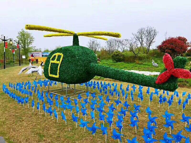 人造綠植雕中的橋、亭、舟、塔、房屋等工藝品,起到藝術烘托和意境創造的作用。仿真植物雕塑通過藝術形象可反映一定的社會時代精神,具有一定的思想內容,既可點綴園景,又可成為園林某一局部甚至全園的構圖中心;而且可以叫你在可能的環境里看到不可能出現的植物。