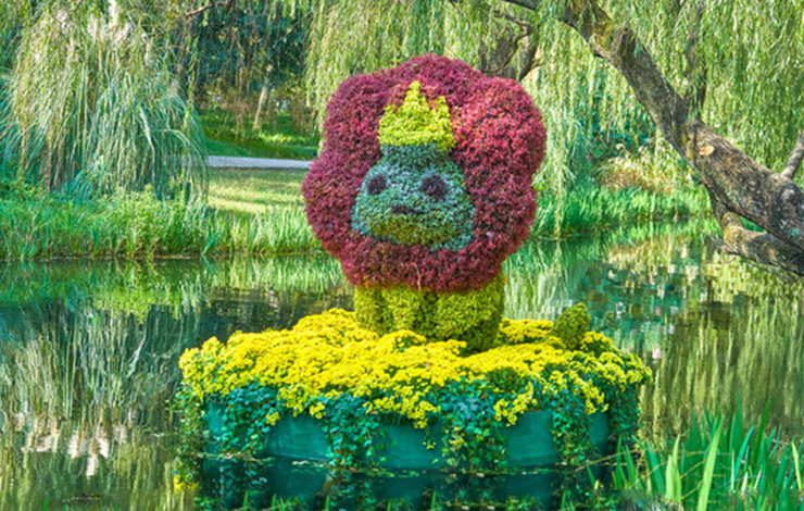 安裝在水上的卡通綠雕,卡通造型可愛,多種顏色搭配制作而成,使卡通形象更加立體化。