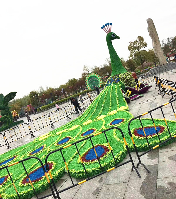 圖中的孔雀造型綠雕非常美觀,整體采用綠色,將孔雀的造型生動的呈現(xiàn)出來,再利用藍色、黃色、紅色等將孔雀的羽毛展現(xiàn)處理,造型逼真,景觀效果非常好。
