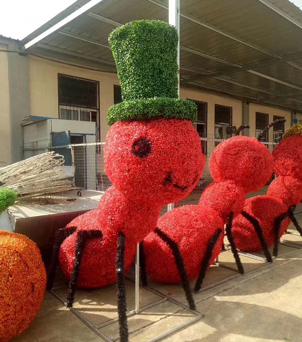 可愛螞蟻綠雕,紅色的螞蟻,綠色的禮帽,黑色的眼、嘴和足,像一個紳士。