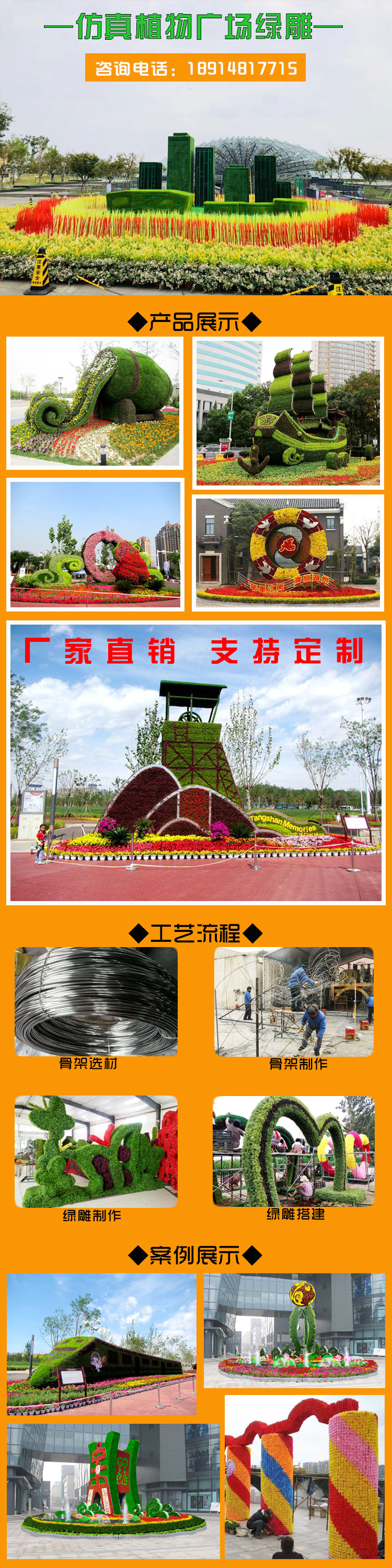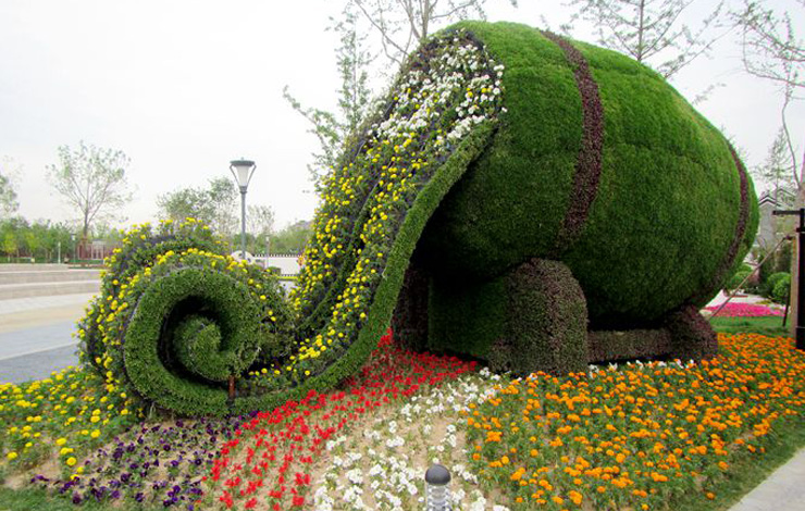 綠雕”被譽(yù)為世界園林藝術(shù)的奇葩,是一種有生命的植物雕塑。一般內(nèi)設(shè)鋼材構(gòu)架,然后在構(gòu)架上填充栽培土,再于其上種植一年生或多年生小灌木或草本植物,即采用掛泥插草或卡盆工藝把不同顏色的花草覆蓋在結(jié)構(gòu)造型的表面,巧妙地把雕塑造型與花卉園藝結(jié)合在一起,鋼架表面的植物覆蓋率至少要達(dá)到80%。因此,綠雕是充滿生機(jī)的“花卉雕塑”,是人類運(yùn)用自然力量創(chuàng)造出的又一園藝文明。